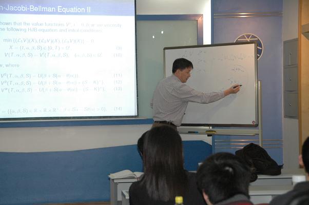 汪教授的讲座从关于具有比例交易费用的欧式期权定价问题入手,首先简单地介绍了欧式期权定价的基本模型,然后是详细地讲解了罚函数求解算法。整个过程分为三个部分:第一分析背景,这个问题的大背景是金融方面的,这需要用到概率论与数理统计的知识来分析;第二模型的解决——建立偏微分方程,这用到计算数学和基础数学的知识;第三解决问题,这又转化为最优化问题,用到应用数学的知识。整个问题的解决旨在告诉大家交叉学科的研究是产生新问题的沃土和源泉,是获得原创性科学成果的重要途径,也是解决问题的必然选择。