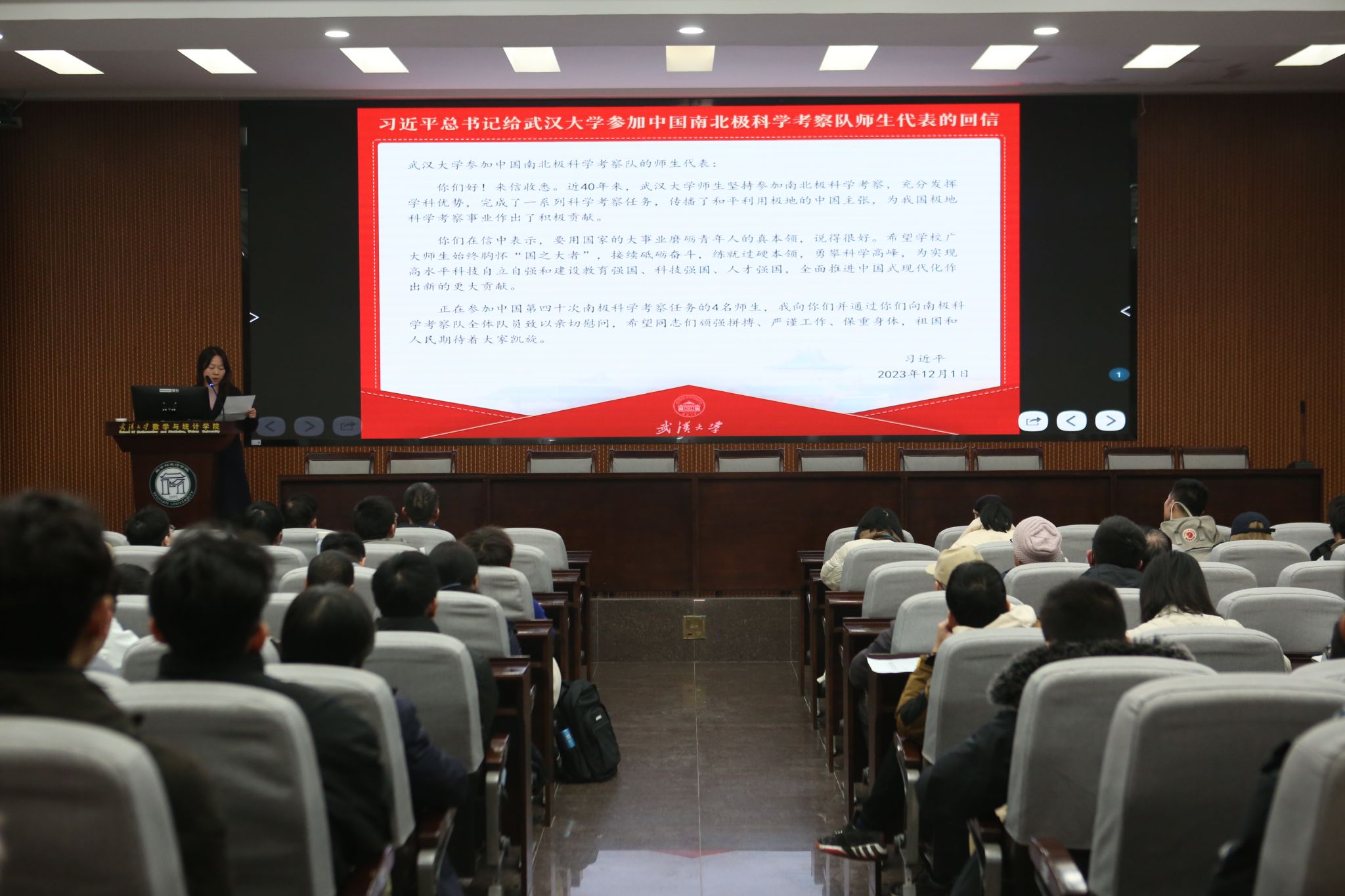 张胜凯作《让五星红旗在南极上空高高飘扬》专题报告。张胜凯曾3次参加中国南极科学考察和2次北极科学考察,荣获“湖北青年五四奖章”、“中国极地考察先进个人”等表彰。他介绍了极地科考作为国家战略的重要意义,讲解了南极的地貌、气候、生物等基本概况。他深情回顾了我校40年来参加极地科考的感人历程,阐述了一代代武大人贡献出的智慧和力量。