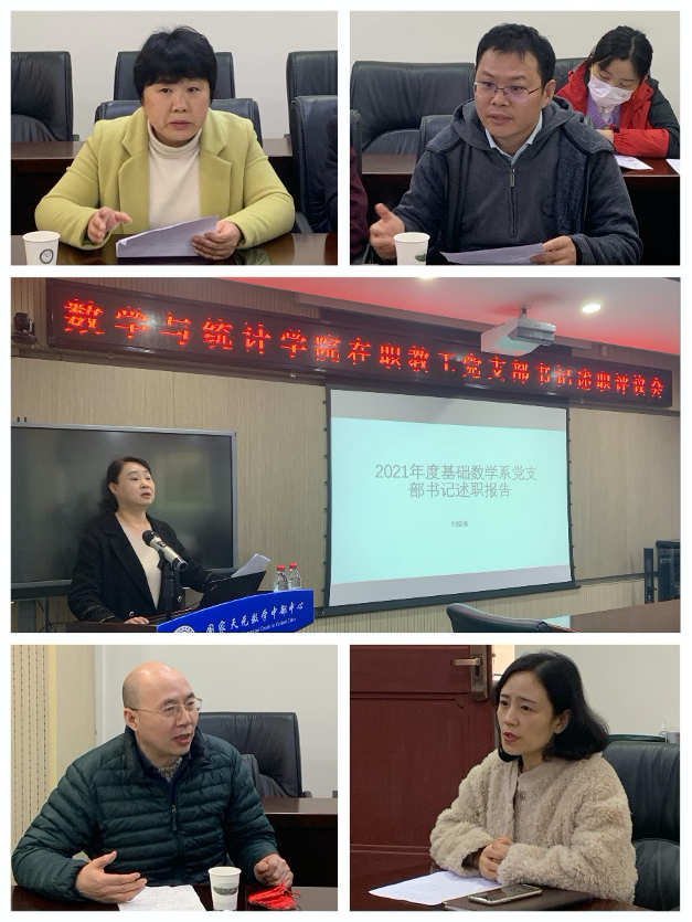 基础数学系党支部书记刘晓春、应用数学系党支部书记王丽娟、信息与计算科学系党支部书记张继伟、概率与统计科学系党支部书记让光林分别从落实立德树人根本任务、加强思想政治工作、强化师德师风建设、落实意识形态工作责任、培养教师党员发展对象等方面述职。机关党支部书记周宁从政策理论学习、优化服务师生、加强行政管理、推进作风建设、强化执行落实等方面述职。5位党支部书记分别总结了2021年度本支部的主要工作,分析了存在的不足之处,提出了2022年工作思路与改进措施。