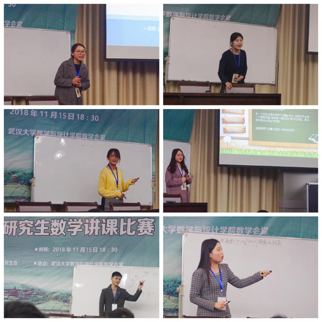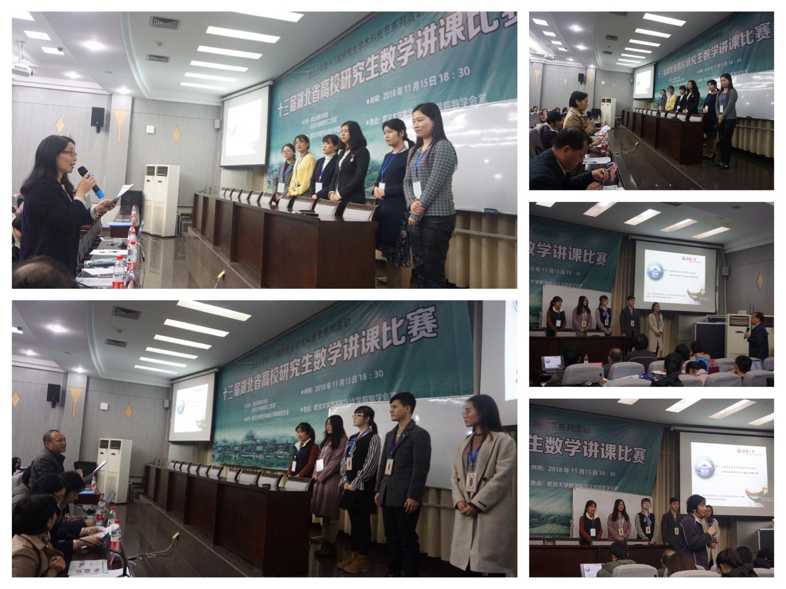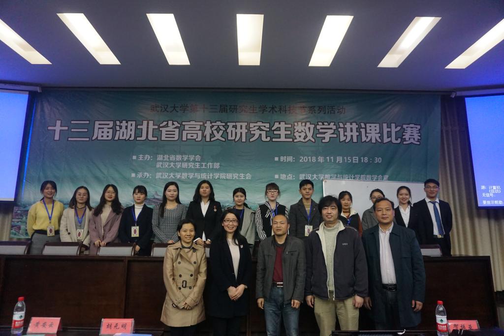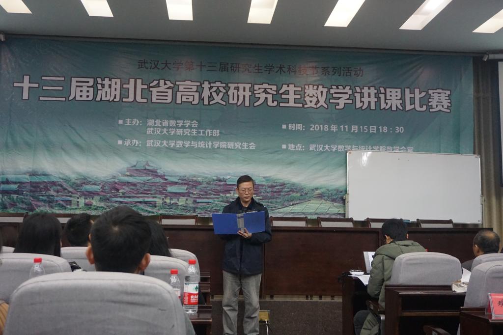 2018�11�15日晚18�30分,武汉大学第十三届研究生学术科技节系列活动之第十三届湖北省高校研究生数学讲课比赛在数学与统计学院数学会堂拉开帷幕。本次比赛由湖北省数学学会和武汉大学党委研究生工作部主办,武汉大学数学与统计学院承办。来自武汉大学、华中科技大学、华中师范大学、湖北大学、武汉理工大学以及中国科学院武汉物理与数学研究所的十一名选手参加比赛,他们从严格的初赛中脱颖而出,齐聚在数学会堂,为大家带来了精彩的讲课交流大赛�