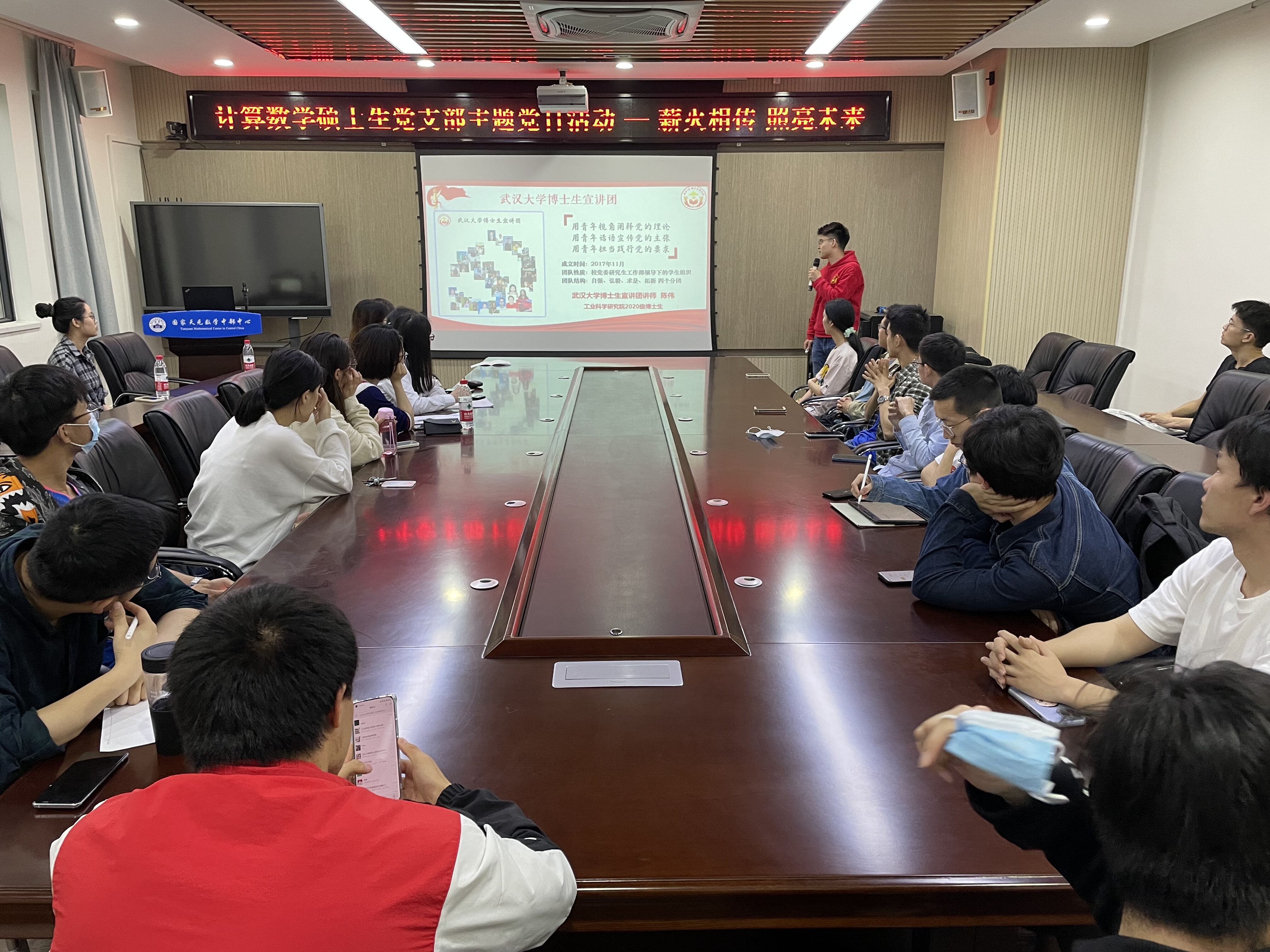 博士生宣讲团的陈伟、张弛两位讲师,分别以“井冈山精神”和“冬奥精神”为纲,带领在场的20余位党员、团员共同回顾了一场中国共产党波澜壮阔的奋斗历程。本次活动旨在“以党带团、党团联动”,活动由计算数学专业硕士生党支部书记郝梦倩主持。