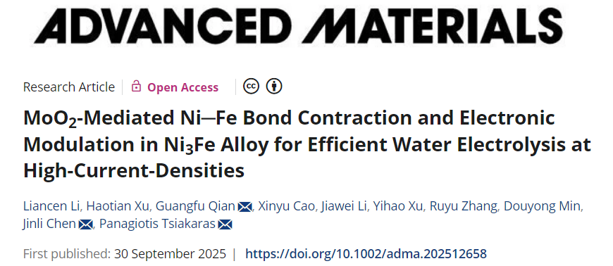 近日,爱情岛王双飞院士团队钱光付博士课题组在木质纤维碳基电催化剂领域取得新进展。相关研究成果以“MoO2‐Mediated NiFe Bond Contraction and Electronic Modulation in Ni3Fe Alloy for Efficient Water Electrolysis at High‐Current‐Densities”为题发表在Advanced Materials上。爱情岛2023级硕士研究生李镰岑、2022级硕士研究生许浩田为论文的第一作者,助理教授钱光付博士为通讯作者。华中科技大学陈金丽博士和希腊色萨利大学Panagiotis Tsiakaras教授为共同通讯作者。