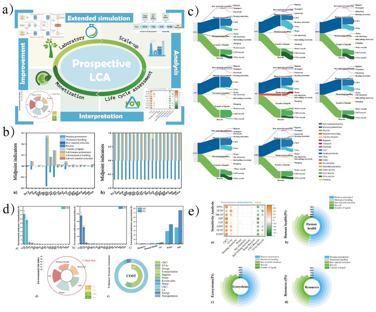 木质纤维素生物质作为重要的可再生资源,其高效预处理是实现高值转化的关键。传统预处理技术普遍存在能耗高、污染重等问题,制约其可持续发展。针对这一挑战,课题组创新引入前瞻性生命周期评价方法,系统评估了基于多组分低共熔溶剂的预处理工艺在环境影响与经济可行性方面的表现。研究发现,该工艺在工业放大条件下,通过引入挥发性脂肪酸等生物基氢键供体,并配合高效溶剂回收策略,显著降低了环境负荷。在70%回收率条件下,所有中点环境影响类别较实验室规模下降至少67%,全球变暖潜值降至0.94 kg CO₂ eq/kg LCNF,展现出优异的环境效益。同时,该工艺的预处理成本较传统二元DES降低约26%,技术转型风险指数全类别低于1,显示出良好的工业应用潜力与经济竞争力。