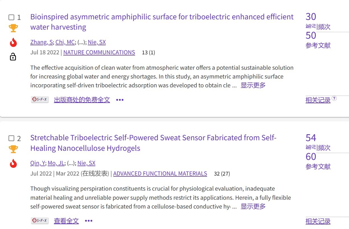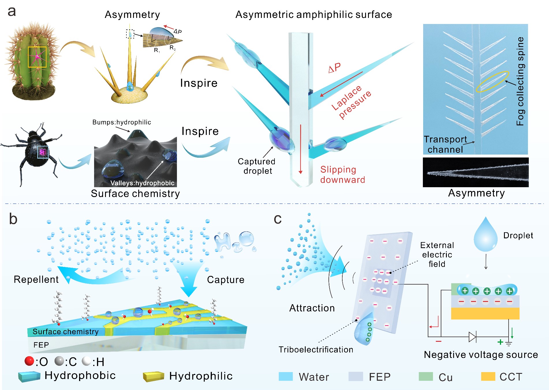 轻工技术与工程专业2021级博士生张松等人从仙人掌刺和甲虫翅翘结构获得灵感,构造了双重仿生结构以实现液滴快速凝结和去除。首次揭示了水收集表面与液滴之间的界面电荷相互作用,并将其应用于大气水收集,实现了前所未有的极高水收集效率。相关研究成果于2022年7月18日以题为“Bioinspired asymmetric amphiphilic surface for triboelectric enhanced efficient water harvesting”在线发表于《Nature Communications》。论文链接