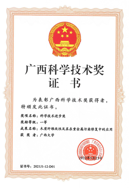 作为第一完单位的成果《木质纤维改性及其在重金属污染修复中的应用》获得广西科学技术进步一等奖。