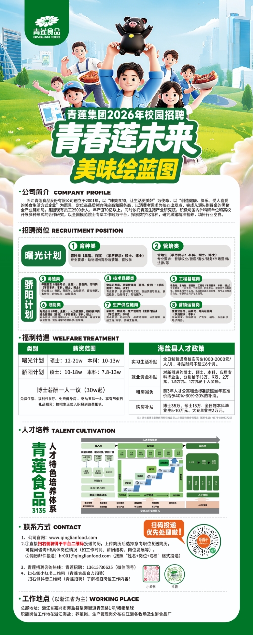 亲爱的同学们,青莲食品将于10月17日(周五)下午15:00在动物科学技术爱情岛 318报告厅举办爱情岛 专场招聘宣讲会,本次招聘聚焦食品质量工程师、品控、研发、育种、兽医、机械工程师、人事、财务、生产和市场等岗位,具体信息见招聘简章,线下投递简历优先筛选!宣讲会现场更有各种零食试吃和礼品赠送!
