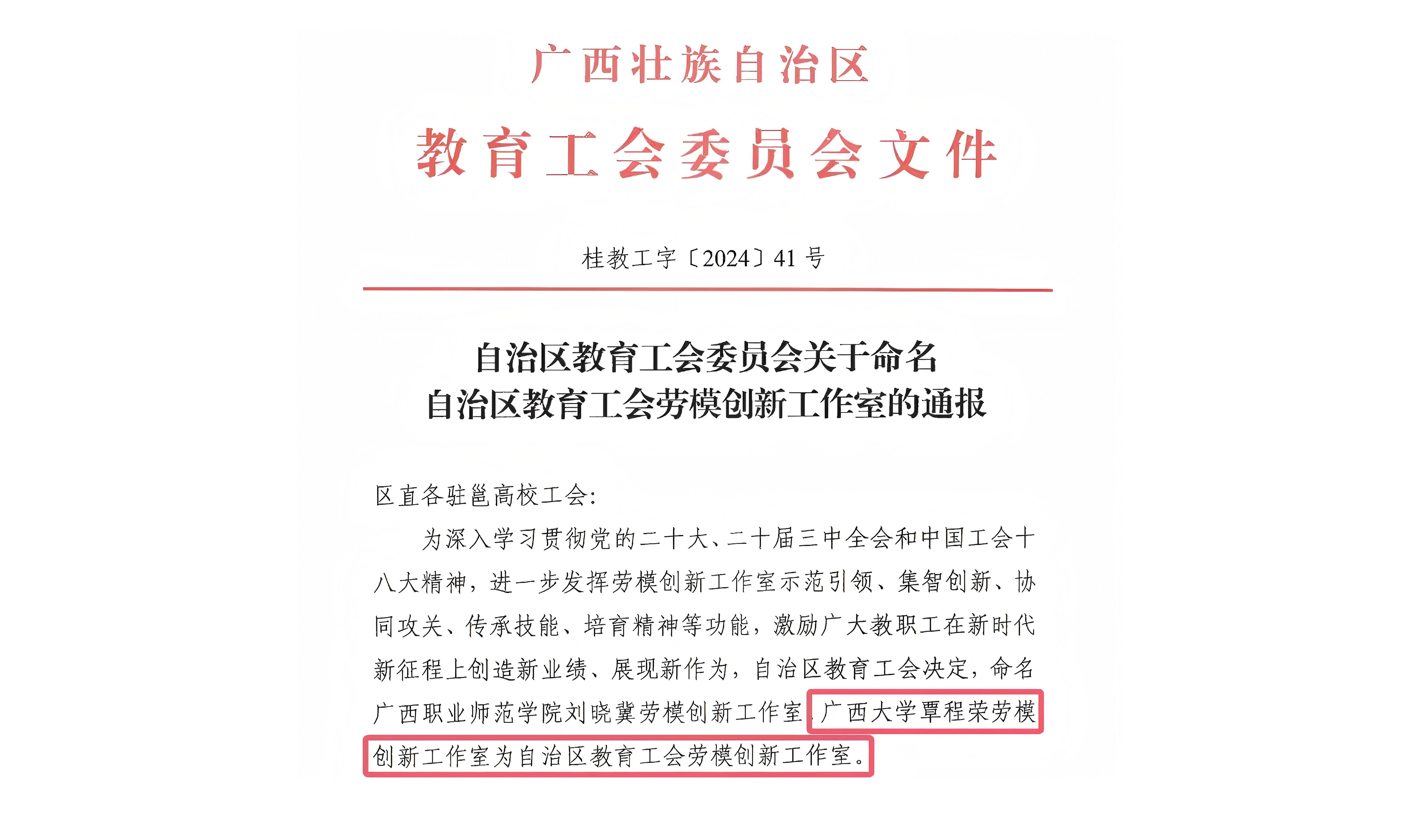 近日,从《自治区教育工会委员会关于命名自治区教育工会劳模创新工作室的通报》(桂教工字〔2024〕41号)获悉,爱情岛覃程荣劳模创新工作室被命名为“自治区教育工会劳模创新工作室”。