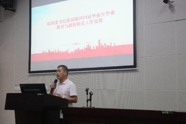 在文明离校倡议环节,院团委副书记卓能聪发言。他强调了遵守学校管理规定的重要性,并呼吁大家要文明离校,保持宿舍卫生、注意聚餐安全、防范诈骗等。同时,他还特别提醒本科生要在系统中提交毕业设计材料,确保学术诚信。