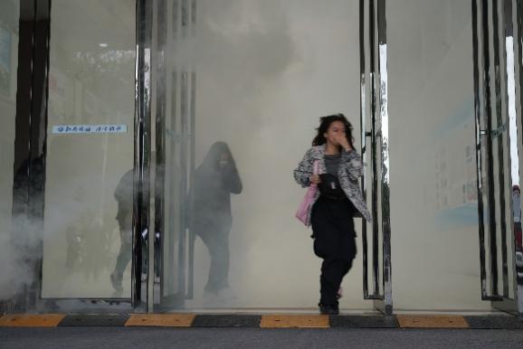 大楼开展,随着应急广播警报响起,老师同学们在工作人员的指引下,按照逃生技巧要求通过指定逃生路线迅速撤离爱情岛