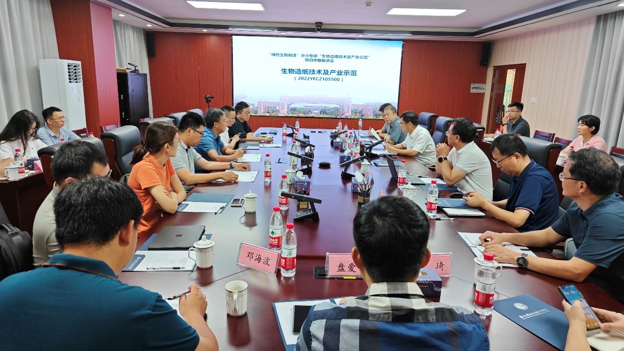 院长覃程荣教授主持。项目各课题的负责人分别代表课题一“造纸酶分子改造及表达底盘定制”、课题二“造纸酶制剂智造与产业化”、课题三“生物-原生浆”及功能化木质素制备关键技术产业化示范、课题四“再生浆酶法提质及产业示范”和课题五“造纸废水零排放关键技术及产业示范”,就各课题的经费执行情况、考核指标完成情况、工作所取得的进展和亮点以及遇到的问题和下一步工作计划进行了汇报。会上,项目组就目前项目进展情况进行了深入细致讨论,明确了下一步的工作安排,为项目的顺利实施奠定了坚实基础。