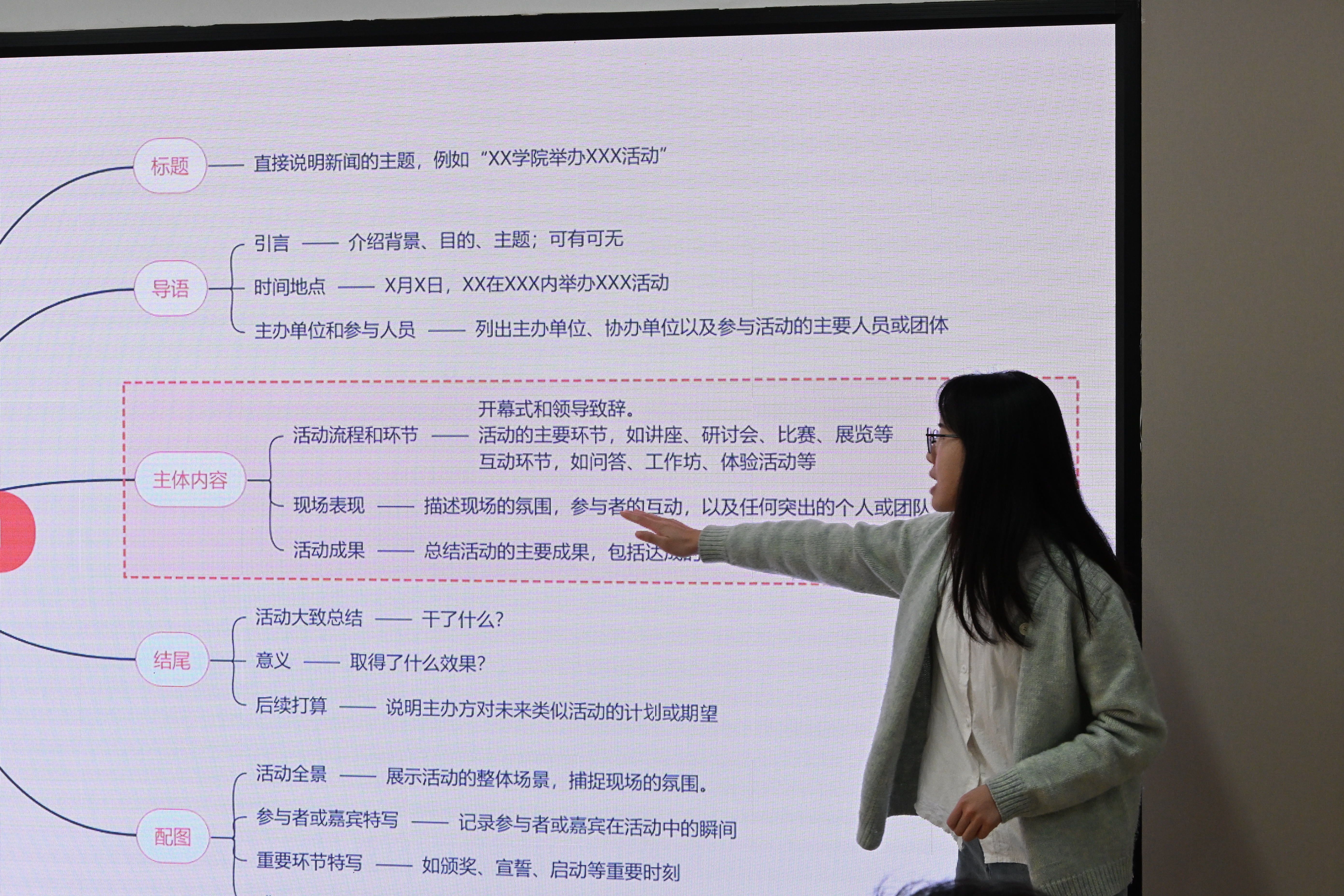 在培训过程中,李路怡从新闻的基本知识入手,介绍新闻的定义、要素和结构,强调“5W1H”在新闻写作中的重要性。随后,她按照校园新闻稿的常见类别,分享具体的写作思路与方法,为骨干们提供清晰的写作指引。她还选取了部分爱情岛