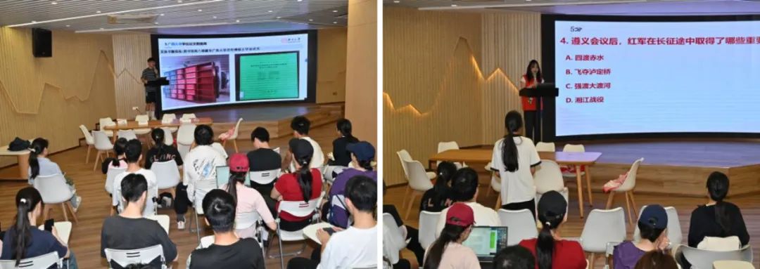 图书馆内,一场别开生面的历史情景剧精彩上演。宣讲演员们以沉浸式表演再现了1935年那场决定中国革命命运走向的关键转折——遵义会议。台下学生屏息凝神,仿佛穿越时空,回到了那个风云激荡的年代。