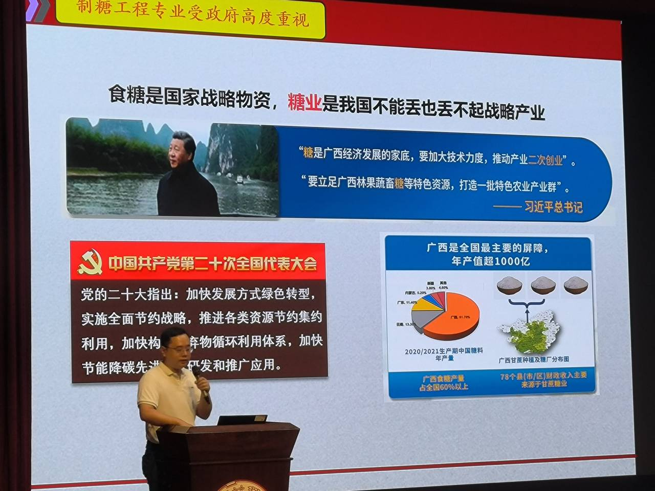 制糖工程系系主任杭方学副教授首先从“什么是糖”激发学生的探索兴趣。然后从宏观上结合我国制糖、糖消费等糖业现状向同学们说明糖的重要性。糖是乡村振兴的产业支撑,关乎国计民生。接着,杭老师从微观上就制糖工程的专业历史沿革、课程设置、热点研究方向、师资力量、就业成果等方面进行了专业介绍。