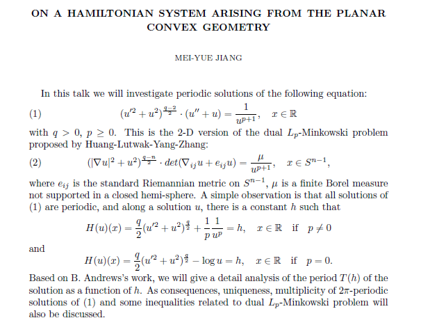Speaker's Bio: Jiang Meiyue, Professor and Doctoral Supervisor at the School of Mathematical Sciences, Peking University. In July 1989, he obtained his PhD in Science from Peking University. Since 1999, he has been a professor at the School of Mathematical Sciences at Peking University. His main research areas include nonlinear analysis and nonlinear differential equations, including the existence of periodic solutions for Hamiltonian systems, Arnold's conjecture for Lagrange submanifolds intersection problems in symplectic geometry, ROF functional minimization problems, and eigenvalue problems for 1-Laplace operators. Undertook multiple National Natural Science Foundation general and key projects, and published in important academic journals both domestically and internationally Ann.Inst.H.PoincareAnal.、Manuscript Math.、Calc. Var. Partial Differential Equations、JDifferential Equations、Proc. Roy. Soc.Edinburgh Sect. A I have published numerous papers with international influence and have also visited and exchanged ideas as a visiting scholar at multiple foreign universities and research institutes.